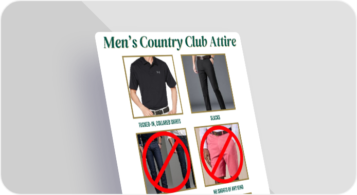 PAGE 19 Men’s Country Club Attire Men’s Country Club Attire TUCKED-IN, COLLARED SHIRTS SLACKS N D i N C g Sh t NO DENIM NO SHORTS OF ANY KIND NO HATS NO OPEN TOED SHOES
