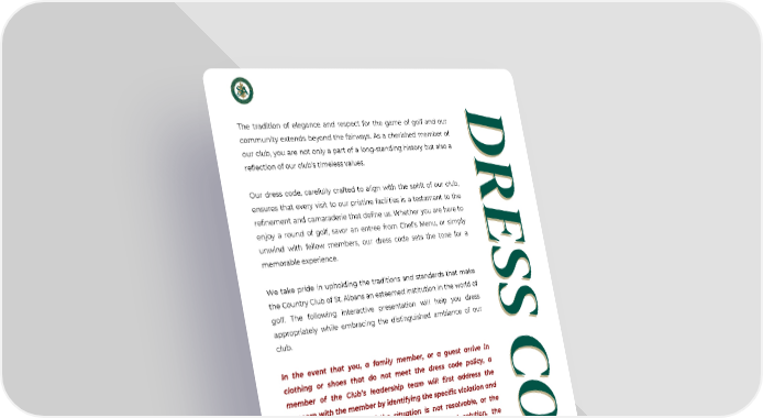 DRESS CODE DRESS CODE The tradition of elegance and respect for the game of golf and our community extends beyond the fairways. As a cherished member of our club, you are not only a part of a long-standing history but also a reflection of our club’s timeless values. Our dress code, carefully crafted to align with the spirit of our club, ensures that every visit to our pristine facilities is a testament to the refinement and camaraderie that define us. Whether you are here to enjoy a round of golf, savor an entree from Chef’s Menu, or simply unwind with fellow members, our dress code sets the tone for a memorable experience. We take pride in upholding the traditions and standards that make the Country Club of St. Albans an esteemed institution in the world of golf. The following interactive presentation will help you dress appropriately while embracing the distinguished ambiance of our club. In the event that you, a family member, or a guest arrive in clothing or shoes that do not meet the dress code policy, a member of the Club’s leadership team will first address the concern with the member by identifying the specific violation and suggesting a solution. If the situation is not resolvable, or the member chooses not to accept the suggested solution, the individual not aligning with Club policy will not be allowed access to any area of the club, including but not limited to the golf courses, driving range, dining areas, pool, or racquet sports. The Board of Directors and Rules Committee Chair are responsible for the creation and implementation of these rules. Thank you for your commitment to maintaining the excellence and tradition that make our club exceptional. Warmest Regards, CCSA Board of Directors