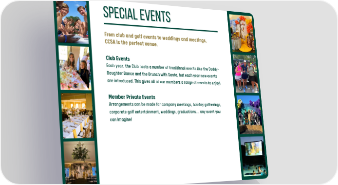 Special Events Special Events Club Events Each year, the Club hosts a number of traditional events like the Daddy- Daughter Dance and the Brunch with Santa, but each year new events are introduced. This gives all of our members a range of events to enjoy! From club and golf events to weddings and meetings, CCSA is the perfect venue. Member Private Events Arrangements can be made for company meetings, holiday gatherings, corporate golf entertainment, weddings, graduations.... any event you can imagine!