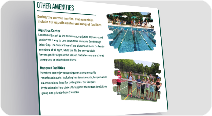 Other Amenities Other Amenities Aquatics Center Located adjacent to the clubhouse, our junior olympic-sized pool offers a way to cool down from Memorial Day through Labor Day. The Snack Shop offers a luncheon menu for family members of all ages, while the Tiki Bar serves adult beverages throughout the season. Swim lessons are offered on a group or private based level. During the warmer months, club amenities include our aquatic center and racquet facilities. Racquet Facilities Members can enjoy racquet games on our recently resurfaced courts, including two tennis courts, two pickleball courts and one lined for both games. Our Racquet Professional offers clinics throughout the season in addition group and private-based lessons.