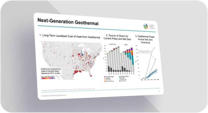 Next-Generation Geothermal 2. Source of Steam for 3. Geothermal Power 1. Long-Term Levelized Cost of Heat from Geothermal Current Policy and Net Zero Across Net Zero Scenarios Current Policy Central 180 4.5 4.0 160 3.5 Constrained Wind 140 3.0 EJ2.5 120 2.0 GW100 1.5 80 1.0 Bubble size represents the 0.5 60 scale of industrial steam 0.0 4 0 5 0 5 0 4 0 5 0 5 0 40 demand at 150°C or less. 02 03 03 04 04 05 02 03 03 04 04 05 2 2 2 2 2 2 2 2 2 2 2 2 Thermal Storage Geothermal Boiler 20 Hydrogen Biomass 0 Heat Pump Pipeline Gas 2024 2030 2035 2040 2045 2050 Dual-fuel Electric Other fossil Levelized Cost of Heat Map produced by Jesse Carney, EER Summery Fellow 2024 © 2024 by Evolved Energy Research 10