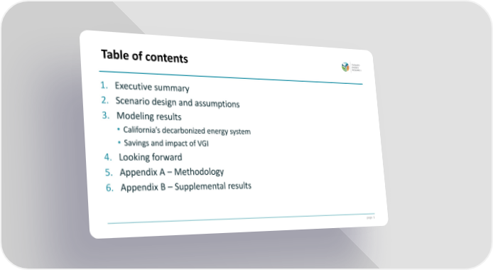page 3 1. Executive summary 2. Scenario design and assumptions 3. Modeling results • California’s decarbonized energy system • Savings and impact of VGI 4. Looking forward 5. Appendix A – Methodology 6. Appendix B – Supplemental results Table of contents
