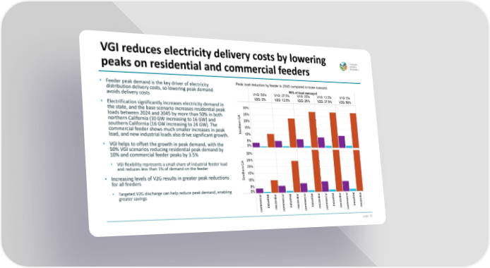 page 29 • Feeder peak demand is the key driver of electricity distribution delivery costs, so lowering peak demand avoids delivery costs • Electrification significantly increases electricity demand in the state, and the base scenario increases residential peak loads between 2024 and 2045 by more than 50% in both northern California (10 GW increasing to 16 GW) and southern California (16 GW increasing to 24 GW). The commercial feeder shows much smaller increases in peak load, and new industrial loads also drive significant growth. • VGI helps to offset the growth in peak demand, with the 50% VGI scenarios reducing residential peak demand by 10% and commercial feeder peaks by 3.5% • VGI flexibility represents a small share of industrial feeder load and reduces less than 1% of demand on the feeder • Increasing levels of V2G results in greater peak reductions for all feeders • Targeted V2G discharge can help reduce peak demand, enabling greater savings VGI reduces electricity delivery costs by lowering peaks on residential and commercial feeders