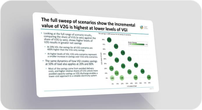 page 34 • Looking at the full range of scenario results, comparing the share of V1G (x-axis) against the share of V2G (y-axis), shows higher levels of V2G results in greater net savings • At 20% VGI, the savings for all V2G scenarios are 400% higher than the V1G-only savings. • At higher levels of VGI, V2G only scenarios represent a smaller increase in savings over V1G-only scenarios. • The same dynamics of how VGI creates savings at 50% of load also applies at 20% and 80% • Most of the savings come from avoided delivery costs, and higher relative shares of V2G unlock more avoided capacity savings as V2G discharge enables a lower-cost approach to a reliable electricity system The full sweep of scenarios show the incremental value of V2G is highest at lower levels of VGI