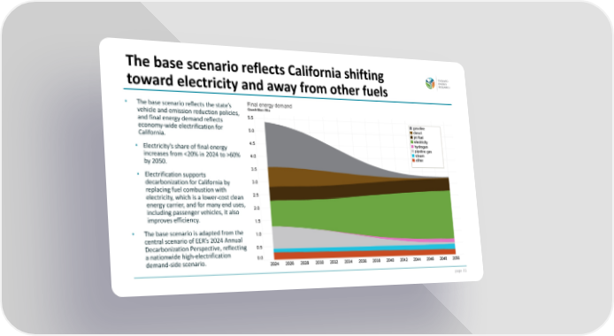 page 22 • The base scenario reflects the state’s vehicle and emission reduction policies, and final energy demand reflects economy-wide electrification for California. • Electricity’s share of final energy increases from 60% by 2050. • Electrification supports decarbonization for California by replacing fuel combustion with electricity, which is a lower-cost clean energy carrier, and for many end uses, including passenger vehicles, it also improves efficiency. • The base scenario is adapted from the central scenario of EER’s 2024 Annual Decarbonization Perspective, reflecting a nationwide high-electrification demand-side scenario. The base scenario reflects California shifting toward electricity and away from other fuels