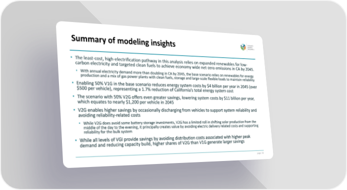 page 20 • The least-cost, high-electrification pathway in this analysis relies on expanded renewables for low- carbon electricity and targeted clean fuels to achieve economy wide net-zero emissions in CA by 2045. • With annual electricity demand more than doubling in CA by 2045, the base scenario relies on renewables for energy production and a mix of gas power plants with clean fuels, storage and large-scale flexible loads to maintain reliability • Enabling 50% V1G in the base scenario reduces energy system costs by $4 billion per year in 2045 (over $500 per vehicle), representing a 1.7% reduction of California’s total energy system cost • The scenario with 50% V2G offers even greater savings, lowering system costs by $11 billion per year, which equates to nearly $1,200 per vehicle in 2045 • V2G enables higher savings by occasionally discharging from vehicles to support system reliability and avoiding reliability-related costs • While V2G does avoid some battery storage investments, V2G has a limited roll in shifting solar production from the middle of the day to the evening, it principally creates value by avoiding electric delivery related costs and supporting reliability for the bulk system • While all levels of VGI provide savings by avoiding distribution costs associated with higher peak demand and reducing capacity build, higher shares of V2G than V1G generate larger savings Summary of modeling insights