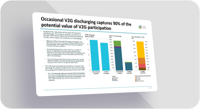page 32 • To explore the robustness of the value of occasional V2G discharge, this analysis included a sensitivity on the 50% V2G scenario exploring the technical potential of V2G, which relaxes the constraints on discharging • Nearly four-fifths of the total V2G energy discharged in the 50% V2G scenario occurs during the 60 days with the greatest daily discharge, where select hours use more than half the available discharge capability. • Occasional discharge from V2G is driven by a number of factors, including the assumptions that constrain V2G behavior in this analysis, like variable O&M of $100/MWh and state-of-charge penalty are key assumptions that limit how often V2G discharges. • This V2G technical potential sensitivity reduces the variable O&M to $1/MWh, and removes the state-of-charge penalty except for when state-of-charge falls below 30%. • The V2G technical potential sensitivity increases V2G discharge by a factor of almost four but only increases the savings of the 50% V2G scenario by less than 10%. • The V2G discharge captures more than 90% of the benefits from the technical potential sensitivity with discharge that is equivalent to adding 600 miles per year (compared to more than 2,000 miles per year for the technical potential scenario). Occasional V2G discharging captures 90% of the potential value of V2G participation