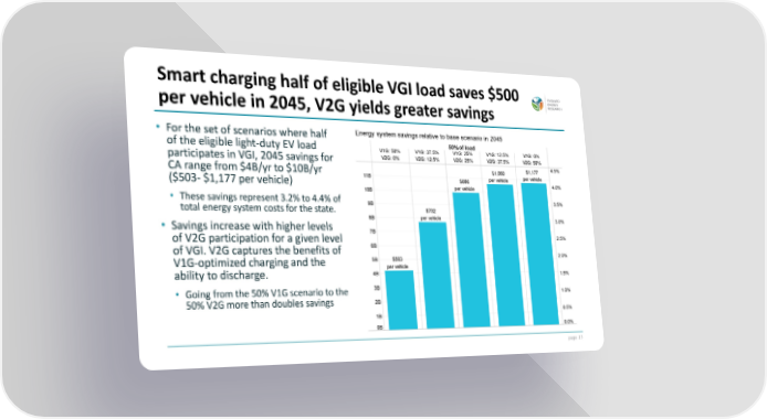 page 27 • For the set of scenarios where half of the eligible light-duty EV load participates in VGI, 2045 savings for CA range from $4B/yr to $10B/yr ($503- $1,177 per vehicle) • These savings represent 3.2% to 4.4% of total energy system costs for the state. • Savings increase with higher levels of V2G participation for a given level of VGI. V2G captures the benefits of V1G-optimized charging and the ability to discharge. • Going from the 50% V1G scenario to the 50% V2G more than doubles savings Smart charging half of eligible VGI load saves $500 per vehicle in 2045, V2G yields greater savings