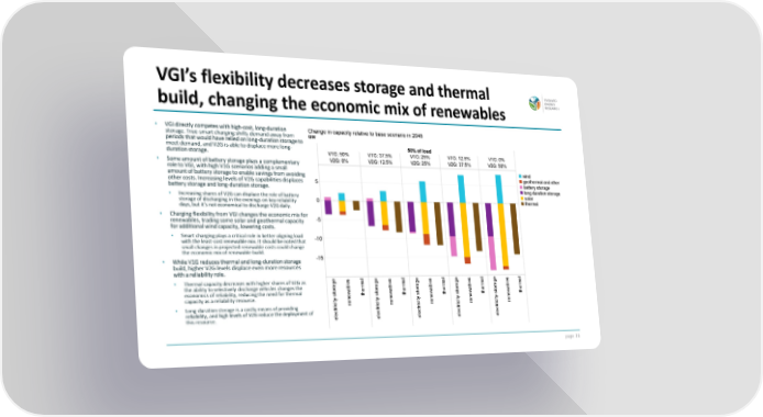 page 30 • VGI directly competes with high-cost, long-duration storage. True-smart charging shifts demand away from periods that would have relied on long-duration storage to meet demand, and V2G is able to displace more long- duration storage. • Some amount of battery storage plays a complementary role to VGI, with high V1G scenarios adding a small amount of battery storage to enable savings from avoiding other costs. Increasing levels of V2G capabilities displaces battery storage and long-duration storage. • Increasing shares of V2G can displace the role of battery storage of discharging in the evenings on key reliability days, but it’s not economical to discharge V2G daily. • Charging flexibility from VGI changes the economic mix for renewables, trading some solar and geothermal capacity for additional wind capacity, lowering costs. • Smart charging plays a critical role in better-aligning load with the least-cost renewable mix. It should be noted that small changes in projected renewable costs could change the economic mix of renewable build. • While V1G reduces thermal and long-duration storage build, higher V2G levels displace even more resources with a reliability role. • Thermal capacity decreases with higher shares of V2G as the ability to selectively discharge vehicles changes the economics of reliability, reducing the need for thermal capacity as a reliability resource. • Long-duration storage is a costly means of providing reliability, and high levels of V2G reduce the deployment of this resource. VGI’s flexibility decreases storage and thermal build, changing the economic mix of renewables