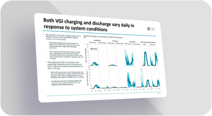 page 31 • VGI transforms the LDV charging shape into a flexible resource that responds to system needs on an hourly basis. • Optimized charging works on each feeder to respond to hourly needs, shifting load to avoid feeder peaks and to align with renewable generation. • This contrasts with bulk system battery storage that is deployed to meet bulk system needs, principally shifting solar production to later in the day, and shows less variability in behavior than VGI charging. • Discharging from V2G is infrequent, only supporting reliability needs on key days and hours rather than shifting solar production to later in the day. • While V2G avoids some level of battery build, the remaining bulk system storage complements V2G’s behavior, with each providing different forms of flexibility that support a reliable, least-cost system. • All scenarios with V2G, including the 80% V2G scenario, show similar behavior of discharge isolated to key reliability periods. Both VGI charging and discharge vary daily in response to system conditions