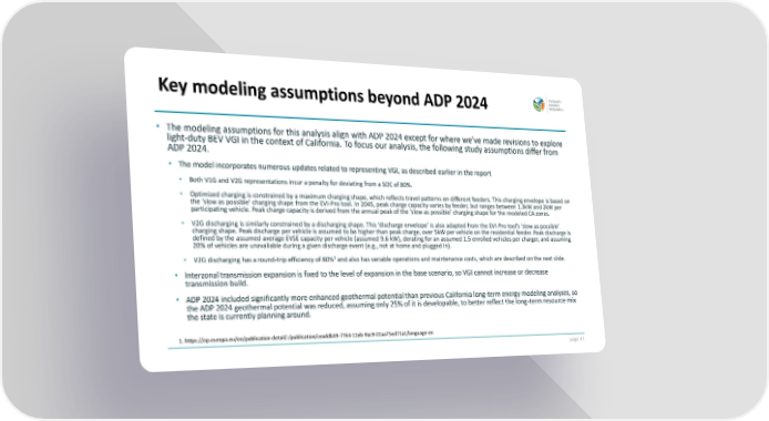 page 47 • The modeling assumptions for this analysis align with ADP 2024 except for where we’ve made revisions to explore light-duty BEV VGI in the context of California. To focus our analysis, the following study assumptions differ from ADP 2024. • The model incorporates numerous updates related to representing VGI, as described earlier in the report • Both V1G and V2G representations incur a penalty for deviating from a SOC of 80%. • Optimized charging is constrained by a maximum charging shape, which reflects travel patterns on different feeders. This charging envelope is based on the ‘slow as possible’ charging shape from the EVI-Pro tool. In 2045, peak charge capacity varies by feeder, but ranges between 1.3kW and 2kW per participating vehicle. Peak charge capacity is derived from the annual peak of the ‘slow as possible’ charging shape for the modeled CA zones. • V2G discharging is similarly constrained by a discharging shape. This ‘discharge envelope’ is also adapted from the EVI-Pro tool’s ‘slow as possible’ charging shape. Peak discharge per vehicle is assumed to be higher than peak charge, over 5kW per vehicle on the residential feeder. Peak discharge is defined by the assumed average EVSE capacity per vehicle (assumed 9.6 kW), derating for an assumed 1.5 enrolled vehicles per charger, and assuming 20% of vehicles are unavailable during a given discharge event (e.g., not at home and plugged in). • V2G discharging has a round-trip efficiency of 80%1 and also has variable operations and maintenance costs, which are described on the next slide. • Interzonal transmission expansion is fixed to the level of expansion in the base scenario, so VGI cannot increase or decrease transmission build. • ADP 2024 included significantly more enhanced geothermal potential than previous California long-term energy modeling analyses, so the ADP 2024 geothermal potential was reduced, assuming only 25% of it is developable, to better reflect the long-term resource mix the state is currently planning around. Key modeling assumptions beyond ADP 2024 1. https://op.europa.eu/en/publication-detail/-/publication/ceaddb39-7763-11eb-9ac9-01aa75ed71a1/language-en
