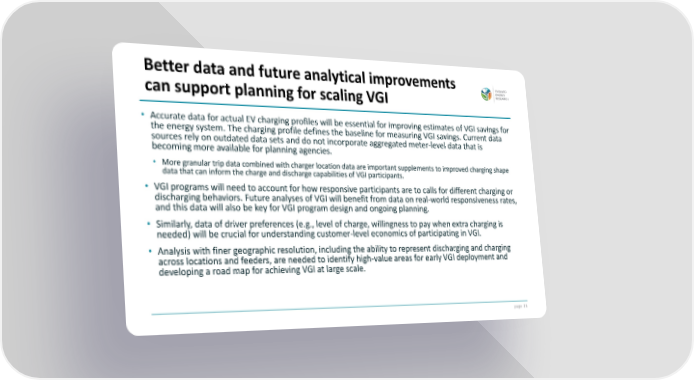 page 39 • Accurate data for actual EV charging profiles will be essential for improving estimates of VGI savings for the energy system. The charging profile defines the baseline for measuring VGI savings. Current data sources rely on outdated data sets and do not incorporate aggregated meter-level data that is becoming more available for planning agencies. • More granular trip data combined with charger location data are important supplements to improved charging shape data that can inform the charge and discharge capabilities of VGI participants. • VGI programs will need to account for how responsive participants are to calls for different charging or discharging behaviors. Future analyses of VGI will benefit from data on real-world responsiveness rates, and this data will also be key for VGI program design and ongoing planning. • Similarly, data of driver preferences (e.g., level of charge, willingness to pay when extra charging is needed) will be crucial for understanding customer-level economics of participating in VGI. • Analysis with finer geographic resolution, including the ability to represent discharging and charging across locations and feeders, are needed to identify high-value areas for early VGI deployment and developing a road map for achieving VGI at large scale. Better data and future analytical improvements can support planning for scaling VGI
