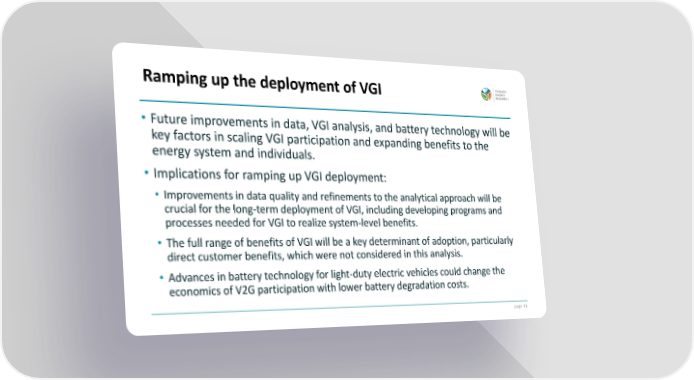 page 38 • Future improvements in data, VGI analysis, and battery technology will be key factors in scaling VGI participation and expanding benefits to the energy system and individuals. • Implications for ramping up VGI deployment: • Improvements in data quality and refinements to the analytical approach will be crucial for the long-term deployment of VGI, including developing programs and processes needed for VGI to realize system-level benefits. • The full range of benefits of VGI will be a key determinant of adoption, particularly direct customer benefits, which were not considered in this analysis. • Advances in battery technology for light-duty electric vehicles could change the economics of V2G participation with lower battery degradation costs. Ramping up the deployment of VGI
