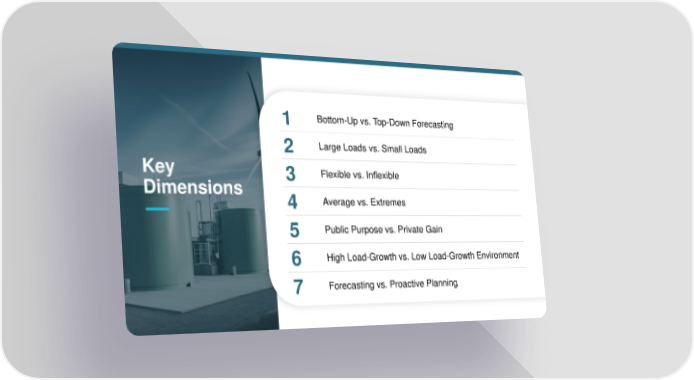Key Dimensions 1 Bottom - Up vs. Top - Down Forecasting 2 Large Loads vs. Small Loads 3 Flexible vs. Inflexible 4 Average vs. Extremes 5 Public Purpose vs. Private Gain 6 High Load - Growth vs. Low Load - Growth Environment 7 Forecasting vs. Proactive Planning