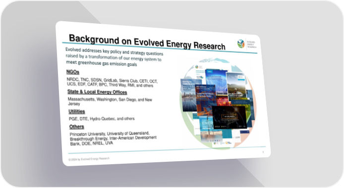 2024 by Evolved Energy Research 2 Evolved addresses key policy and strategy questions raised by a transformation of our energy system to meet greenhouse gas emission goals Background on Evolved Energy Research NGOs NRDC, TNC, SDSN, GridLab , Sierra Club, CETI, OCT, UCS, EDF, CATF, BPC, Third Way, RMI, and others State & Local Energy Offices Massachusetts, Washington, San Diego, and New Jersey Utilities PGE, DTE, Hydro Quebec, and others Others Princeton University, University of Queensland, Breakthrough Energy, Inter - American Development Bank, DOE, NREL, UVA