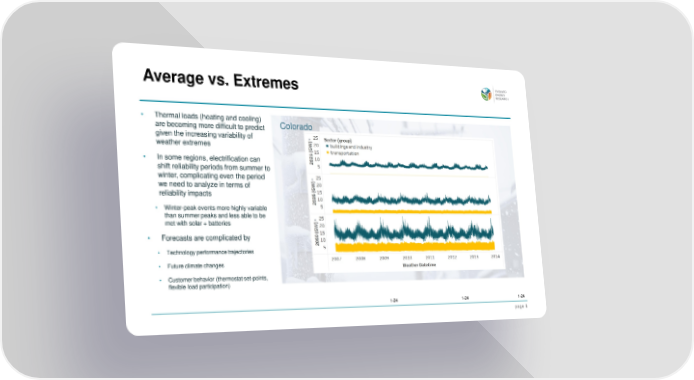 p a g e 8 Average vs. Extremes Thermal loads (heating and cooling) are becoming more difficult to predict given the increasing variability of weather extremes In some regions, electrification can shift reliability periods from summer to winter, complicating even the period we need to analyze in terms of reliability impacts Winter - peak events more highly variable than summer peaks and less able to be met with solar + batteries Forecasts are complicated by Technology performance trajectories Future climate changes Customer behavior (thermostat set - points, flexible load participation) Colorado 1 - 24 1 - 24 1 - 24