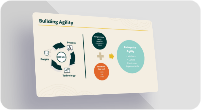 Building Agility Competencies • Change Leadership • Psychological Safety Structured Approach •OCM •PM •AGILE Enterprise Agility • Mindsets • Culture • Continuous Improvements Change Leadership & Organizational Change Management (OCM) Overview Page 2 Video Player is loading.Play VideoPlaySkip BackwardSkip ForwardMuteCurrent Time 0:00/Duration -:-Loaded: 0%0:00Stream Type LIVESeek to live, currently behind liveLIVERemaining Time --:- 1xPlayback RateChaptersChaptersDescriptionsdescriptions off, selectedCaptionscaptions settings, opens captions settings dialogcaptions off, selectedAudio TrackPicture-in-PictureFullscreenThis is a modal window.The media could not be loaded, either because the server or network failed or because the format is not supported.Beginning of dialog window. Escape will cancel and close the window.TextColorWhiteBlackRedGreenBlueYellowMagentaCyanOpacityOpaqueSemi-TransparentText BackgroundColorBlackWhiteRedGreenBlueYellowMagentaCyanOpacityOpaqueSemi-TransparentTransparentCaption Area BackgroundColorBlackWhiteRedGreenBlueYellowMagentaCyanOpacityTransparentSemi-TransparentOpaqueFont Size50%75%100%125%150%175%200%300%400%Text Edge StyleNoneRaisedDepressedUniformDrop shadowFont FamilyProportional Sans-SerifMonospace Sans-SerifProportional SerifMonospace SerifCasualScriptSmall CapsResetDoneClose Modal DialogEnd of dialog window.