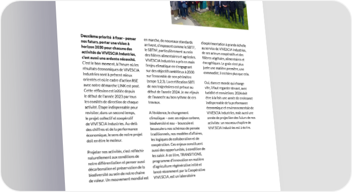 VIVESCIA INDUSTRIES 2022-2023 Avril 2023, les actionnaires coopératifs et institutionnels, partenaires et administrateurs indépendants de SICOM, se sont déplacés en Allemagne à la découverte des différentes activités de VIVESCIA Industries situées près de Munich. Deuxième priorité à 昀椀xer - penser en marche, de nouveaux standards d’expérimentation à grande échelle 1 nos futurs, porter une vision à arrivent, s’imposent comme le SBTi , au service de VIVESCIA Industries, 2 horizon 2030 pour chacune des le SBTN , particulièrement au sein de ses acteurs coopératifs et des activités de VIVESCIA Industries, des 昀椀lières alimentaires et agricoles. 昀椀lières végétales, alimentaires et c’est aussi une ardente nécessité. VIVESCIA Industries a pris en main énergétiques. Le grain n’est plus C’est le bon moment, à l’heure où les l’enjeu climatique en s’engageant juste une matière première, une résultats économiques de VIVESCIA sur des objectifs ambitieux à 2030 commodité, il est bien plus que cela. Industries sont à présent mieux sur l’ensemble de son périmètre orientés et où le cadre d’action RSE (scope 1,2,3). La certi昀椀cation SBTi Oui, dans ce monde qui change avec notre démarche LINK est posé. de nos trajectoires est prévue au vite, il faut regarder devant, avec Cette ré昀氀exion est initiée depuis début de l’année 2024 .Je me réjouis lucidité et convictions. 2024 doit le début de l’année 2023 par tous de l’avancée au bon rythme de ces être à la fois une année de croissance les comités de direction de chaque travaux. indispensable de la performance activité. Etape indispensable pour économique et environnementale de revisiter, dans un second temps, A l’évidence, le changement VIVESCIA Industries, mais aussi une le projet collectif et coopératif climatique – avec ses enjeux carbone, année de projection des futurs de nos de VIVESCIA Industries. Au-delà biodiversité et eau – bouscule et activités : un nouveau chapitre de des chiffres et de la performance bousculera nos schémas de pensée VIVESCIA Industries est à écrire. économique, le sens de notre projet traditionnels, nos modèles d’affaires, doit en être le moteur. les logiques de collaboration et de coopération. Ces enjeux constituent Projeter nos activités, c’est ré昀氀échir aussi des opportunités, à condition de naturellement aux conditions de les saisir. A ce titre, TRANSITIONS, notre différentiation et penser aussi programme d’innovation en matière décarbonation et préservation de la d’agriculture régénérative initié et biodiversité au sein de notre chaine lancé récemment par la Coopérative de valeur. Un mouvement mondial est VIVESCIA, est un laboratoire *Le Commandité de VIVESCIA Industries 1. SBTi : Créé au lendemain de l’Accord de Paris en 2015 et issu d’une collaboration entre plusieurs institutions au niveau mondial, dont l’ONU, le Science Based Targets Initiative (SBTi), fait aujourd’hui référence en matière de trajectoire carbone des entreprises. https://sciencebasedtargets.org/ 2. SBTN : S’appuyant sur les travaux de l’initiative Science Based Targets (SBTi) sur le changement climatique, le Science Based Targets Network (SBTN) reconnaît la nécessité de développer des méthodes et des orientations sur la 昀椀xation d’objectifs scienti昀椀ques – similaires au climat – pour la biodiversité, l’eau, la terre et les océans. Le SBTN vise à créer une nouvelle économie mondiale dans laquelle la science dé昀椀nit comment les entreprises et les villes peuvent fonctionner de manière écologiquement durable pour rétablir l’équilibre des systèmes terrestres. Une première version de sa méthodologie a été publiée en mai 2023. 03