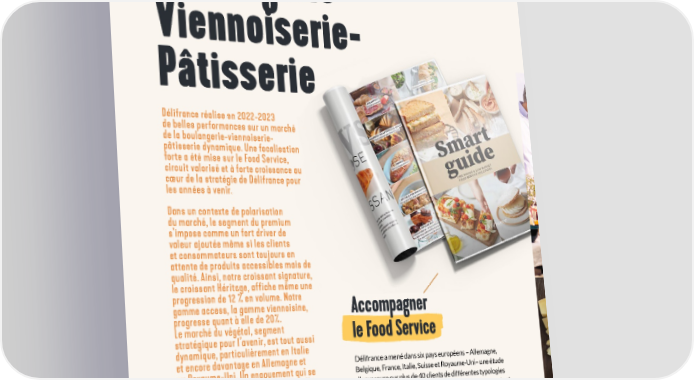 CAHIER DES ACTIONNAIRES VIVESCIA INDUSTRIES 2022-2023 Boulangerie- Viennoiserie- Pâtisserie Délifrance réalise en 2022-2023 de belles performances sur un marché de la boulangerie-viennoiserie- pâtisserie dynamique. Une focalisation forte a été mise sur le Food Service, circuit valorisé et à forte croissance au cœur de la stratégie de Délifrance pour les années à venir. Dans un contexte de polarisation du marché, le segment du premium s’impose comme un fort driver de valeur ajoutée même si les clients et consommateurs sont toujours en attente de produits accessibles mais de qualité. Ainsi, notre croissant signature, le croissant Héritage, affiche même une progression de 12 % en volume. Notre gamme access, la gamme viennoisine, Accompagner progresse quant à elle de 20%. Le marché du végétal, segment le Food Service stratégique pour l’avenir, est tout aussi dynamique, particulièrement en Italie et encore davantage en Allemagne et Délifrance a mené dans six pays européens – Allemagne, au Royaume-Uni. Un engouement qui se Belgique, France, Italie, Suisse et Royaume-Uni– une étude traduit par une augmentation de 28 % d’envergure sur plus de 40 clients de différentes typologies de nos ventes de viennoiseries vegan. (restaurants et cafés indépendants, chaînes de restaurants et distributeurs) a昀椀n de mieux comprendre les attentes et dé昀椀s du Cette année a également été marquée Food Service. Les résultats de cette enquête nourrissent notre par le lancement de la démarche RSE stratégie relationnelle avec ce réseau. Parmi nos premières Baking Good BETTER, pilier majeur réalisations : le déploiement dans huit pays du Smart Guide, un de la stratégie de l’entreprise et en livret de recettes et astuces, et le lancement d’une campagne droite ligne avec LINK, la démarche du sponsorisée LinkedIn, ayant généré d’excellents résultats. Groupe VIVESCIA. 16 17