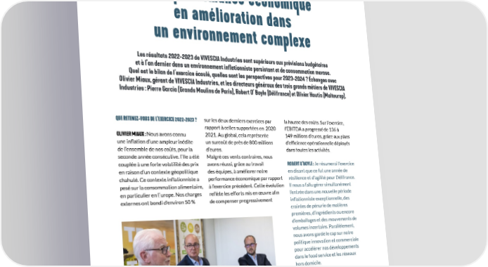 CAHIER DES ACTIONNAIRES VIVESCIA INDUSTRIES 2022-2023 Une performance économique en amélioration dans un environnement complexe Les résultats 2022-2023 de VIVESCIA Industries sont supérieurs aux prévisions budgétaires et à l’an dernier dans un environnement inflationniste persistant et de consommation morose. Quel est le bilan de l’exercice écoulé, quelles sont les perspectives pour 2023-2024 ? Échanges avec Olivier Miaux, gérant de VIVESCIA Industries, et les directeurs généraux des trois grands métiers de VIVESCIA Industries : Pierre Garcia (Grands Moulins de Paris), Robert O’ Boyle (Délifrance) et Olivier Hautin (Malteurop). QUE RETENEZ-VOUS DE L’EXERCICE 2022-2023 ? sur les deux derniers exercices par la hausse des coûts. Sur l’exercice, rapport à celles supportées en 2020- l’EBITDA a progressé de 136 à OLIVIER MIAUX : Nous avons connu 2021. Au global, cela représente 149 millions d’euros, grâce aux plans une in昀氀ation d’une ampleur inédite un surcoût de près de 800 millions d’ef昀椀cience opérationnelle déployés de l’ensemble de nos coûts, pour la d’euros. dans toutes les activités. seconde année consécutive. Elle a été Malgré ces vents contraires, nous couplée à une forte volatilité des prix avons réussi, grâce au travail ROBERT O’BOYLE : Je résumerai l’exercice en raison d’un contexte géopolitique des équipes, à améliorer notre en disant que ce fut une année de chahuté. Ce contexte in昀氀ationniste a performance économique par rapport résilience et d’agilité pour Délifrance. pesé sur la consommation alimentaire, à l’exercice précédent. Cette évolution Il nous a fallu gérer simultanément en particulier en Europe. Nos charges re昀氀ète les efforts mis en œuvre a昀椀n l’entrée dans une nouvelle période externes ont bondi d’environ 50 % de compenser progressivement in昀氀ationniste exceptionnelle, des craintes de pénurie de matières premières, d’ingrédients ou encore d’emballages et des mouvements de volumes incertains. Parallèlement, nous avons gardé le cap sur notre politique innovation et commerciale pour accélérer nos développements dans le food service et les réseaux hors domicile. PIERRE GARCIA : Nous avons également ressenti un repli de la consommation sur nos marchés clés. Les Grands Moulins de Paris ont dû faire face à une nouvelle problématique chez nos clients boulangers, celle de la hausse 08 09