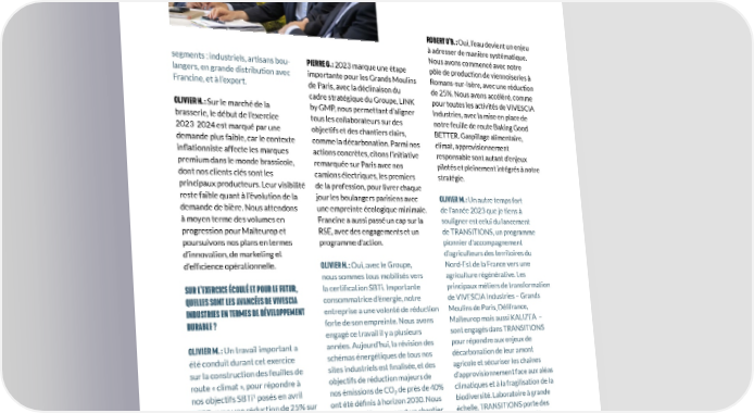 CAHIER DES ACTIONNAIRES VIVESCIA INDUSTRIES 2022-2023 ROBERT O’B. : Oui, l’eau devient un enjeu à adresser de manière systématique. Nous avons commencé avec notre segments : industriels, artisans bou- PIERRE G. : 2023 marque une étape pôle de production de viennoiseries à langers, en grande distribution avec importante pour les Grands Moulins Romans-sur-Isère, avec une réduction Francine, et à l’export. de Paris, avec la déclinaison du de 25%. Nous avons accéléré, comme cadre stratégique du Groupe, LINK pour toutes les activités de VIVESCIA OLIVIER H. : Sur le marché de la by GMP, nous permettant d’aligner Industries, avec la mise en place de brasserie, le début de l’exercice tous les collaborateurs sur des notre feuille de route Baking Good 2023-2024 est marqué par une objectifs et des chantiers clairs, BETTER. Gaspillage alimentaire, demande plus faible, car le contexte comme la décarbonation. Parmi nos climat, approvisionnement in昀氀ationniste affecte les marques actions concrètes, citons l’initiative responsable sont autant d’enjeux premium dans le monde brassicole, remarquée sur Paris avec nos pilotés et pleinement intégrés à notre dont nos clients clés sont les camions électriques, les premiers stratégie. principaux producteurs. Leur visibilité de la profession, pour livrer chaque reste faible quant à l’évolution de la jour les boulangers parisiens avec OLIVIER M. : Un autre temps fort demande de bière. Nous attendons une empreinte écologique minimale. de l’année 2023 que je tiens à à moyen terme des volumes en Francine a aussi passé un cap sur la souligner est celui du lancement progression pour Malteurop et RSE, avec des engagements et un de TRANSITIONS, un programme poursuivons nos plans en termes programme d’action. pionnier d’accompagnement d’innovation, de marketing et d’agriculteurs des territoires du d’ef昀椀cience opérationnelle. OLIVIER H. : Oui, avec le Groupe, Nord-Est de la France vers une nous sommes tous mobilisés vers agriculture régénérative. Les SUR L’EXERCICE ÉCOULÉ ET POUR LE FUTUR, la certi昀椀cation SBTi. Importante principaux métiers de transformation QUELLES SONT LES AVANCÉES DE VIVESCIA consommatrice d’énergie, notre de VIVESCIA Industries – Grands INDUSTRIES EN TERMES DE DÉVELOPPEMENT entreprise a une volonté de réduction Moulins de Paris, Délifrance, DURABLE ? forte de son empreinte. Nous avons Malteurop mais aussi KALIZEA – engagé ce travail il y a plusieurs sont engagés dans TRANSITIONS OLIVIER M. : Un travail important a années. Aujourd’hui, la révision des pour répondre aux enjeux de été conduit durant cet exercice schémas énergétiques de tous nos décarbonation de leur amont sur la construction des feuilles de sites industriels est 昀椀nalisée, et des agricole et sécuriser les chaînes route « climat », pour répondre à objectifs de réduction majeurs de d’approvisionnement face aux aléas 1 nos objectifs SBTi posés en avril nos émissions de CO de près de 40% climatiques et à la fragilisation de la 2 2023, avec une réduction de 25% sur ont été dé昀椀nis à horizon 2030. Nous biodiversité. Laboratoire à grande notre empreinte carbone (scopes 1, avons par ailleurs ouvert un chantier échelle, TRANSITIONS porte des 2, 3) d’ici 2030 et de 38% sur notre clé sur la gestion de l’eau. Notre solutions qui ont vocation à être responsabilité directe. nouvelle malterie au Mexique en est dupliquées ailleurs sur le territoire une illustration avec plus de 80% de français et au-delà, des solutions l’eau recyclée. utiles pour les 昀椀lières et nos clients. 1. SBTi : créé au lendemain de l’Accord de Paris et issu d’une collaboration entre plusieurs institutions au niveau mondial, dont l’ONU, le Science Based Targets Initiative (SBTi) fait aujourd’hui référence en matière de trajectoire carbone des entreprises. 10 11