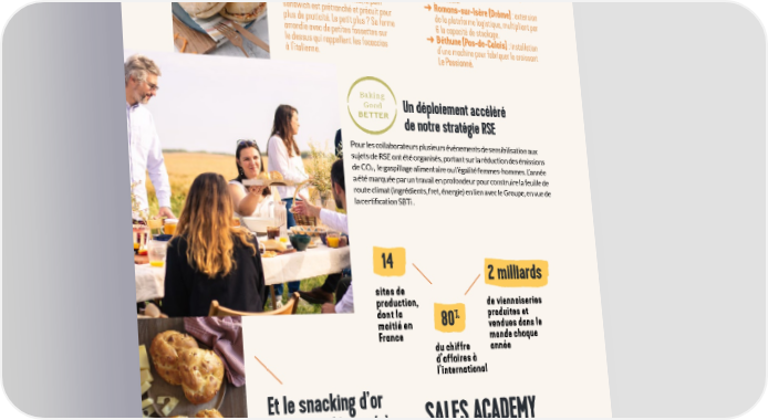 VIVESCIA INDUSTRIES 2022-2023 Nature ou aux graines, investissements qui optimisent à chacun sa flaguette 3l’outil industriel Flaguette innove avec deux variétés à ➜ Liscate (Italie) : ouverture d’une ligne de découvrir. Fabriqué avec des ingrédients pain boule. soigneusement sélectionnés, le pain ➜ Romans-sur-Isère (Drôme) : extension sandwich est prétranché et précuit pour de la plateforme logistique, multipliant par plus de praticité. Le petit plus ? Sa forme 6 la capacité de stockage. arrondie avec de petites fossettes sur ➜ Béthune (Pas-de-Calais) : installation le dessus qui rappellent les focaccias d’une machine pour fabriquer le croissant à l’italienne. Le Passionné. Baking Good Un déploiement accéléré BETTER de notre stratégie RSE Pour les collaborateurs plusieurs événements de sensibilisation aux sujets de RSE ont été organisés, portant sur la réduction des émissions de CO , le gaspillage alimentaire ou l’égalité femmes-hommes. L’année 2 a été marquée par un travail en profondeur pour construire la feuille de route climat (ingrédients, fret, énergie) en lien avec le Groupe, en vue de la certi昀椀cation SBTi . 14 2 milliards sites de production, de viennoiseries dont la % produites et moitié en 80 vendues dans le France monde chaque du chiffre année d’affaires à l’international Et le snacking d’or SALES ACADEMY 2023 est décerné à… la brioche au fromage Délifrance. Lancée dans 11 pays, la Sales Academy est un programme Élaboré dans l’usine d’Altdorf (Allemagne), sur mesure d’harmonisation et de développement des ce produit gourmand ne contient compétences commerciales. Co-conçu avec plus de ni colorants ni arômes artificiels. 50 collaborateurs de Délifrance, il allie workshops en présentiel, e-learning, webinars et classes virtuelles. Son déploiement se poursuit en 2023-2024. 17