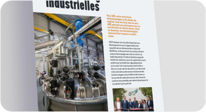 CAHIER DES ACTIONNAIRES VIVESCIA INDUSTRIES 2022-2023 Biotechnologies industrielles Pour ARD, notre activité de biotechnologies et de chimie du végétal, tous les feux sont au vert. ARD poursuit sa croissance avec un portefeuille de clients dense, dans un domaine, les biotechnologies industrielles toujours en plein essor. 2023 marque une nouvelle étape dans son développement avec l’augmentation des capacités de son démonstrateur industriel BioDémo, renforçant ainsi son positionnement unique d’accompagnement de ses clients, du stade laboratoire à l’industrialisation à grande échelle de molécules, pour des applications aussi variées que la chimie 昀椀ne, l’agroalimentaire ou la santé. Cet investissement de 8 millions d’euros lui permet de répondre à une demande internationale soutenue dans le domaine des biotechnologies industrielles et de la mise sur le marché de molécules biosourcées à base de carbone renouvelable, permettant de préparer le monde de l’après-pétrole. De gauche à droite : Olivier de Bohan Président de Cristal Union, Inauguration Christoph Büren Président du groupe VIVESCIA, Henri Prévost Préfet de la Marne, Philippe Aubry Directeur Général d’ARD, Catherine Vautrin Présidente du Grand Reims, Olivier Miaux Directeur Général de VIVESCIA de BioDémo 2 Industries, Anne-Sophie Romagny Sénatrice de la Marne, Xavier Albertini Député de la Marne. 18 19