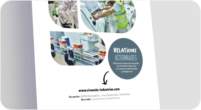 relations ACTIONNAIRES Retrouvez toutes les actualités de VIVESCIA Industries et toutes les informations pratiques sur www.vivescia-industries.com Par courrier : VIVESCIA Industries – 2 rue Clément Ader, 51100 Reims Par e-mail : [email protected]