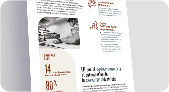 CAHIER DES ACTIONNAIRES 2023—2024 BOULANGERIE-VIENNOISERIE-PÂTISSERIE Un noUVeL OuTil ad hoc pour la gamme Délifrance à reTenir... exTra-ordInaRy Cette gamme exige d’allier technicité et fait main. Des innovations… Inenvisageable donc de la produire sur des lignes à haute et des prix ! cadence. Une ligne dédiée a ainsi été mise en place sur le site de Un Snacking d’or pour la babka Landévant (Bretagne) pour offrir souplesse et adaptabilité en caramel de Délifrance Extra-Ordinary termes de création et de production. Lancement réussi ! et un prix Pépites de la Boulangerie À noter aussi, sur le site de Landévant, le succès de la 2023 pour le cinnamon bun. production de pâtisserie sous atmosphère modi昀椀ée. Online Délifrance monte en puissance… Lancement du blog Délifrance, le Bakery trend spotter, pour les opérateurs foodservice, qui positionne la marque comme un réel business partner. Lancement du compte Instagram Délifrance_Global : inspirations, produits, recettes et astuces au menu ! CHIFFRES CLÉS 14 sites de production, Efficacité OPéraTiOnnelLe dont la moitié en France et optimisation de la caPaciTé industrielle % 80 L’ensemble des sites de viennoiserie tournent désormais en 5x8 du chiffre d’affaires pour maximiser les capacités : le site de Theix (56) a été transformé à l’international pour la réussite du projet Pâtisserie Clean ; plusieurs investissements clés ont été réalisés sur nos usines pour réduire notre empreinte sur l’environnement ; lancement d’une ligne Rheon sur Aldorf (Suisse) pour augmenter la capacité du pain ; et lancement 66 viennoiseries de l’entrepôt à Harnes (62). produites par Délifrance chaque seconde dans le monde VIVESCIA INDUSTRIES 19