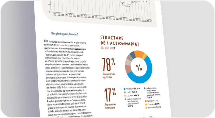 CAHIER DES ACTIONNAIRES 2023—2024 Valeur De rÉFÉrenCe De L’acTion 40 37,95€ 36,80€ 33,70€ € € 32,29 30,40€ 30,14 30 € € 27,71€ 27,55 25,02€ 26,95 24,43€ € € 25,90 24,86 24,10€ € 25,45€ 23,12 € 24,50€ 22,99 22,21€ 23,75€ 23,24€ € 23,74€ 24,05 22,00€ 22,05€ 22,18€ 21,21€ 17,15€ 20 16,70€ 10 0 Avril Oct. Avril Oct. Avril Oct. Avril Oct. Avril Oct. Avril Oct. Avril Oct. Avril Oct. Avril Oct. Avril Oct. Oct. Avril Oct. Mai Oct. Avril Oct. Avril Oct. 2010 2010 2011 2011 2012 2012 2013 2013 2014 2014 2015 2015 2016 2016 2017 2017 2018 2018 2019 2019 2020 2021 2021 2022 2022 2023 2023 2024 2024 Des pistes pour demain ? StructURe N.D. Avec les investissements, le patrimoine De L’acTionnarIaT continue de prendre de la valeur. Les OCTOBRE 2024 performances économiques de cette année se traduisent, d’ailleurs, dans la valeur de l’action, qui atteint 30,14 euros. L’expert indépendant qui établit cette valeur con昀椀rme, ainsi, la bonne trajectoire choisie % depuis plusieurs années. Les investissements pour améliorer la performance opérationnelle 78 et environnementale de nos entreprises doivent se poursuivre : je pense, par Coopératives exemple, aux projets d’énergie alternative agricoles en Espagne ou encore à la nouvelle usine de trituration pour la 昀椀lière soja locale de Rethel (08). Il n’en reste pas moins vrai VIVESCIA 55,16 % Adhérents des que le contexte agricole est compliqué. La volatilité des cours, en particulier celle EMC2 9,06 % coopératives, % collaborateurs et des matières premières, reste d’actualité. CLOVIS1 6,86 % autres actionnaires La plus grande vigilance s’impose, donc, 17 Autres coopératives 5,88 % dans le contexte actuel et à venir. C’est et actionnaires Bpifrance 13 % institutionnels2 Partenaires grâce à notre performance économique Unigrains 2,09 % solide, acquise année après année, que financiers 5,97 % So昀椀protéol 1,98 % nous pourrons accompagner nos entreprises tout en offrant une performance économique partagée avec nos actionnaires, qu’ils soient des coopératifs, des institutionnels ou des porteurs individuels. 5% 4 180 actionnaires individuels Actionnaires au 30 juin 2024 individuels (collaborateurs, agriculteurs des coopératives, FCPE) 1. CLOVIS : holding regroupant les coopératives SCARA, Coopérative agricole de Lorraine, LORCA et Valfrance. 2. Novagrain, Limagrain, 110 Bourgogne, Noriap, Esternay, Juniville, Interval. VIVESCIA INDUSTRIES 11