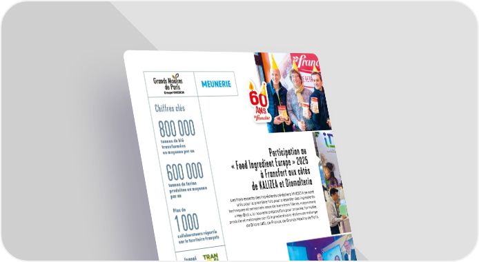 Participation au « Food Ingredient Europe » 2025 à Francfort aux côtés de KALIZEA et Diamalteria Les trois experts des ingrédients céréaliers VIVESCIA se sont unis pour la première fois pour présenter des ingrédients techniques et sensoriels issus de leurs trois filières, notamment « Hey Bro! », la nouvelle préparation pour brownie, formulée, produite et mélangée par ID Ingredients à la station de mélange de Briare (45), de France, de Grands Moulins de Paris. Chiffres clés 800 000 tonnes de blé transformées en moyenne par an 600 000 tonnes de farine produites en moyenne par an Plus de 1 000 collaborateurs répartis sur le territoire français Que retenir de l'exercice 24/25 ? P. G. La qualité des blés 2024 a impacté les rendements de nos moulins et a fortement mobilisé nos équipes, qui ont su faire face à cette situation exceptionnelle avec professionnalisme et engagement. Vos principaux sujets de satisfaction ? P. G. Dans ce contexte difficile, grâce au travail de nos équipes et à la confiance de nos clients, nous avons su maintenir une progression de nos volumes en boulangerie artisanale et dans les industries PieRre GArCiA Directeur général de Grands Moulins de Paris MEUNERIE Engagé dans L'AnNée vUe PAr... Cahiers des actionnaires 2024-2025 17