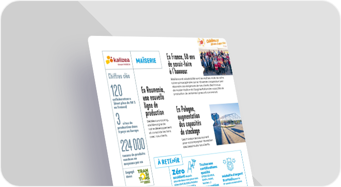 Que retenir de l'exercice 24/25 ? H. N. Malgré un contexte économique et géopolitique perturbé, KALIZEA a réussi à maintenir une bonne performance économique. La diversification de nos activités sur différents marchés (brasserie, snacking, farines…), le suivi de la gestion du risque et le pilotage rigoureux des coûts sont quelques-uns des facteurs qui ont contribué à ce résultat . Vos principaux sujets de satisfaction ? H. N. Notre client Griffith Foods a rejoint le programme TRANSITIONS aux côtés des agriculteurs-coopérateurs VIVESCIA et, pour la première fois, KALIZEA, GMP (ID Ingredients) et Malteurop (Diamalteria) se sont unis sur le salon international de l’ingrédient, le Food Ingredients Europe (FIE), pour présenter des ingrédients techniques et sensoriels issus de nos trois filières. Les perspectives pour les mois à venir ? H. N. La robustesse de nos résultats vaut pour nos trois entités. Ils constituent un socle solide pour envisager sereinement l’avenir et notre croissance. Nous allons continuer d’optimiser notre efficacité opérationnelle, de consolider les gains attendus sur les investissements réalisés au cours de l’exercice passé et d’étudier de nouveaux projets afin de capter de nouvelles opportunités de marché. MAÏSERIE En France, 50 ans de savoir-faire à l’honneur Résilience et adaptabilité sont les maîtres-mots de notre usine quinquagénaire qui se réinvente chaque jour pour répondre aux exigences de nos clients. Des travaux de modernisation et d’augmentation des capacités de production de certaines lignes ont commencé. En Roumanie, une nouvelle ligne de production Dédiée au snacking, elle témoigne de notre développement et consolide les liens avec nos clients. En Pologne, augmentation des capacités de stockage Les travaux se poursuivent pour accompagner l’évolution des besoins de nos clients. Zéro accident depuis plus de deux ans pour nos sites de KALIZEA Polska (Pologne) et KALIZEA Boromir (Roumanie) hUGO nAUDet Directeur général de KALIZEA Toutes nos certifications qualité (FSSC 22 000, GMP+, halal, kasher…) renouvelées À reTeNir Médaille d’argent EcoVadis pour la 9e année consécutive Chiffres clés 120 collaborateurs (dont plus de 50 % en France) 3 sites de production dans 3 pays en Europe 224 000 tonnes de produits vendues en moyenne par an Engagé dans Cahiers des actionnaires 2024-2025 21