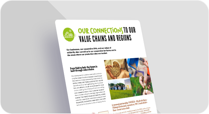 oUR CONNecTIoNS TO OUR VALUE CHAINS AND REGIONS Our businesses, our cooperative DNA, and our values of solidarity also commit us to our cooperative territories and to the areas where our production sites are located. From field to fork: the future is built through value chains Our development model has been built on enhan- cing the value of locally produced crops through the creation of major processing value chains for barley, wheat, and maize, supplying high-volume markets such as malting/brewing, starch produc- tion, and ethanol, as well as more specific value chains meeting diversified specifications in milling and oilseed/protein crops. Customer expecta- tions are becoming increasingly segmented and diverse. The criteria include local sourcing, varietal selection, capacity for consistent supply, plot-level traceability, biodiversity preservation, and contri- butions to the decarbonization of supply chains. A renewed partnership: VIVESCIA – Moulin de Signy- l’Abbaye (Ardennes), a premium, 100 % local wheat– flour–bread value chain The three-year contract, recently renewed in June 2025, seals a virtuous partnership and confirms a shared commitment to a local, sustainable, and high-quality wheat–flour–bread value chain — illustrating a common strategy to support the local economy. Located in the same territory, VIVESCIA and the Moulin de Signy-l’Abbaye have been working for several years to enhance the value of pure milling wheat varieties, from strong wheat to organic milling wheat. Through this partnership, more than 130 VIVESCIA Cooperative farmers supply the mill, which supplies 250 artisan bakers every day. A short supply chain that guarantees local, high-quality products for consumers in the region. NF V30-001 46