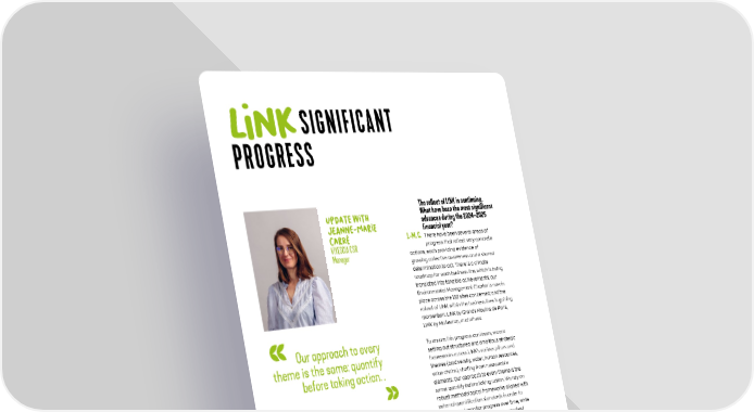UPdaTE WITH JEANNE-MaRIe CaRRÉ VIVESCIA CSR Manager OCT. MARCH SEPT. FEB. JUNE SEPT. 2022 2021 2023 OCT. Commitment to SBTi on climate targets for 2030 MAY Launch of the TRANSITIONS program for VIVESCIA Cooperative farmers Launch of the TRANSITIONS program. Results of the socio- economic impact study of VIVESCIA on its cooperative territory Signature of a three-year partnership with Banques Alimentaires Signature of a five-year partnership with the association Symbiose on biodiversity Launch of a study on the impact of climate change on agricultural production in the cooperative territory Launch of the Environmental Charter LAUNCH OF LINK LINk SIGNIFICANT PROGRESS The rollout of LINK is continuing. What have been the most significant advances during the 2024–2025 financial year? J.-M. C. There have been several areas of progress that reflect very concrete actions, each providing evidence of growing collective awareness and a shared determination to act. There is a climate roadmap for each business line, which is being translated into tangible achievements; our Environmental Management Charter is now in place across the 132 sites concerned; and the rollout of LINK within the business lines is gaining momentum: LINK by Grands Moulins de Paris, LINK by Malteurop, and others. To ensure this progress continues, we are setting out structured and ambitious strategic frameworks across LINK’s various pillars and themes (biodiversity, water, human resources, value chains), starting from measurable elements. Our approach to every theme is the same: quantify before taking action. We rely on robust methodological frameworks aligned with external quantification standards in order to measure and monitor progress over time, while prioritizing initiatives that have the greatest impact in relation to our activities. Our approach to every theme is the same: quantify before taking action. . 2024 32