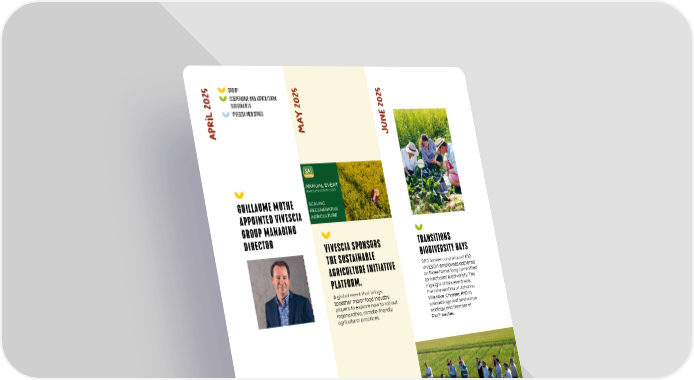 mAY 2025 JUNe 2025 APRIl 2025 GUILLAUME MOTHE APPOINTED VIVESCIA GROUP MANAGING DIRECTOR INAUGURATION OF THE MALTEUROP BIOMASS PLANT IN SEVILLE (SPAIN) COOPERATIVE AND AGRICULTURAL SUBSIDIARIES VIVESCIA INDUSTRIES GROUP 200 farmers and around 100 VIVESCIA employees gathered on three farms long committed to functional biodiversity. The highlight of this event was the intervention of Johanna Villenave-Chasset, PhD in entomology and landscape ecology, and founder of Flor’Insectes. TRANSITIONS BIODIVERSITY DAYS THE YOUNG FARMERS’ COMMITTEE LEARNS ABOUT THE VIVESCIA SEED– BARLEY–MALT VALUE CHAIN VIVESCIA SPONSORS THE SUSTAINABLE AGRICULTURE INITIATIVE PLATFORM. A global event that brings together major food industry players to explore how to roll out regenerative, climate-friendly agricultural practices. 56