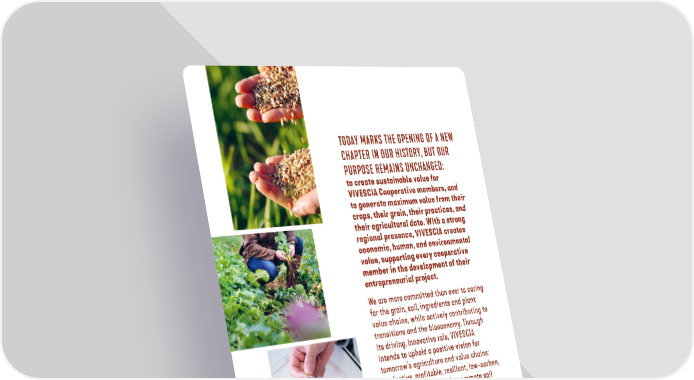 TODAY MARKS THE OPENING OF A NEW CHAPTER IN OUR HISTORY, BUT OUR PURPOSE REMAINS UNCHANGED: to create sustainable value for VIVESCIA Cooperative members, and to generate maximum value from their crops, their grain, their practices, and their agricultural data. With a strong regional presence, VIVESCIA creates economic, human, and environmental value, supporting every cooperative member in the development of their entrepreneurial project. We are more committed than ever to caring for the grain, soil, ingredients and plant value chains, while actively contributing to transitions and the bioeconomy. Through its driving, innovative role, VIVESCIA intends to uphold a positive vision for tomorrow’s agriculture and value chains: productive, profitable, resilient, low-carbon, regenerative practices that promote soil health and biodiversity. Our sustainable development policy, LINK, guides our strategy and permeates all the Group’s businesses. This third integrated report is testament to that. 1