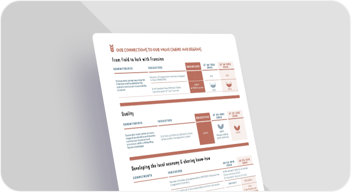 oUR CONNecTIoNS TO oUR VaLUe CHAINS ANd REGIoNS C O M M I T M E N T S I N D I C AT O R S O B J E C T I V E S AT 3 0 J U N E 2 0 2 4 AT 3 0 J U N E 2 0 2 5 Pursue intra-group sourcing for Francine and coordinate the global brand social responsibility program Number of Cooperative members engaged in Club FRANCINE. — 318 310 % of Francine flour (Wheat, Fluide, Suprême) part of Club Francine 100 % of 2024 harvest 57 % 68 % C O M M I T M E N T S I N D I C AT O R S O B J E C T I V E S AT 3 0 J U N E 2 0 2 4 AT 3 0 J U N E 2 0 2 5 Guarantee food safety at every stage of production and develop continuous improvement processes while anticipating future challenges % of sites certified according to a food safety quality management system 100 % 100 % Meoqui malting plant underway 100 % From field to fork with Francine Quality Developing the local economy & sharing know-how 2. The Paris Bakery and Patisserie School 1. Results of a socio-economic impact study conducted in 2023 across the Cooperative’s territory (agricultural and industrial activities of the VIVESCIA Group) C O M M I T M E N T S I N D I C AT O R S A U 3 0 J U I N 2 0 2 4 A U 3 0 J U I N 2 0 2 5 Drive a positive and inclusive economy in the Cooperative’s territory Number of indirect jobs generated by VIVESCIA Group on the Cooperative’s territory. 8 000 emplois indirects et induits1 Étude menée en 2023 À renouveler tous les 3 à 5 ans Subsidies paid out to new cooperative members and young farmers 688 000 € 758 500 € Quantity of flour donated as part of the wheat donation in partnership with Banques Alimentaires 100 t 100 t ¼ des besoins des Banques Alimentaires en France Strengthen the positive impact of our French and international production facilities on local communities Number of charity initiatives implemented by the sites. 95 89 Number of charity initiatives implemented by the sites. Contribute to the development of entrepreneurship and the sustainability of agricultural professions Grands Moulins de Paris Passing on baking know-how at the EBP2 Number of apprentices trained in the year 313 353 Number of professionals who benefited from continuing professional training 460 704 Development of entrepreneurship Number of artisan bakers to receive support in starting a new business 125 116 Forward-looking — continued support for the GERMEA research chair (Groupe d’Études et de Recherches sur les Mutations de l’Entreprise Agricole), dedicated to new forms of agricultural production organization, in partnership with the cooperative groups Euralis and Terrena 73