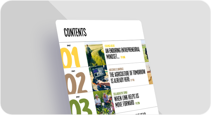 CONTENTS PaRT LOOKING AHEAD AN ENDURING ENTREPRENEURIAL MINDSET... P. 08 COLLABORATIVE SPIRIT WHEN LINK HELPS US MOVE FORWARD P. 28 ANTICIPATE & INNOVATE THE AGRICULTURE OF TOMORROW IS ALREADY HERE P. 18 HIGHLIGHTS OF THE YEAR ACROSS OUR BUSINESS P. 50 GOING FURTHER P. 60 PaRT PaRT 04 PaRT PaRT 02 0 1 03 05 FINANCIAL AND CSR INDICATORS 6