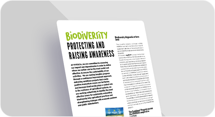 BIODIVeRSITY PROTECTING AND RAISING AWARENESS At VIVESCIA, we are committed to assessing our impact and dependencies in order to define where our action can be the most useful and effective, to ensure the sustainability of our activities. We are making tangible progress through a continuous improvement approach, delivering ambitious projects that create positive momentum across our territories. And because biodiversity plays a central role in the resilience of agricultural systems, we are working collectively to identify the most effective levers for sustainably embedding biodiversity into agricultural practices and strengthening dialogue with economic partners and public stakeholders. Biodiversity diagnostic at farm level The innovation dynamic continues. In 2022, VIVESCIA launched a simplified carbon footprint assessment. Building on the same principle, in autumn 2024 the Group launched the Biodiversity Diagnostic. It is based on AgriBEST®, a simple, free tool deve- loped jointly in 2019 by CDC Biodiversité and La Coopération Agricole, and enhanced in terms of indicators, user experience, and data protection for Cooperative members thanks to contributions from VIVESCIA teams: 15 factors are assessed on a scale of 1 to 5, complemented by the data collec- tion on 13 additional themes specific to VIVESCIA. Accessible to all VIVESCIA Cooperative members via the ARTERRE intranet, this self-assessment tool is dedicated to evaluating the impacts of agricultural practices on biodiversity at farm level. IIt enables an initial assessment and the monito- ring of progress on practices at farm level. The analysis of all diagnostics enabled us to produce a first biodiversity baseline for all VIVESCIA farms across all our territories — an essential step in accelerating our responses and proposals to public stakeholders and processing customers. The next step will be the development of relevant biodiversity indicators that take into account agri- cultural practices, agroecological infrastructure, and local contexts, as part of the TRANSITIONS program. The Symbiose¹ Program across the VIVESCIA cooperative territory The partnership between biodiversity association Symbiose, the Cooperative, and our processing businesses (Malteurop, Délifrance, and Grands Moulins de Paris) continued. VIVESCIA Industries companies are financing three robust ecosystem preservation projects across the Cooperative’s territories. These three long-term “blue and green corridor” projects are designed, with action plans, provisio- nal five-year budgets, and monitoring indicators. They continued throughout financial year 2024– 2025. This initiative also helps to strengthen ties within the Group and reinforce its local agricultu- ral roots. 1. Symbiose, pour des paysages de biodiversité (“Symbiosis, for biodiverse landscapes”) is a non-profit umbrella group for managing biodiversity in the Champagne-Ardenne region. More than diagnostics already completed, 95 % of which involved TRANSITIONS farmers 94 000 ha concernés Près de 500 40