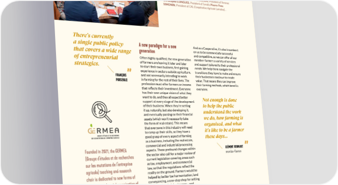 WHAT CONNECTS US ROUND TABLE 2: PUBLIC POLICIES AND THE ROLE OF COOPERATIVES IN SUPPORTING CHANGES TO AGRICULTURAL BUSINESS MODELS. With François PURSEIGLE, sociologist at Agro Toulouse INPENSAT and author of Une agriculture sans agriculteurs (“Agriculture Without Farmers”); Geneviève N’Guyen, agro- economist at Agro Toulouse INP-ENSAT; Frédéric Descrozaille, deputy of Val-de-Marne; Éric Girardin, deputy of Marne; Christoph Büren, President of VIVESCIA; Éric THIROUIN, President of the AGPB; Olivier CHAILLOU, President of Terrena; Christophe CONGUES, President of Euralis; Pierre-Yves SIMONIN, President of CAL (Coopérative Agricole Lorraine). . There’s currently a single public policy A new paradigm for a new And as a Cooperative, it’s also incumbent that covers a wide range generation on us to be commercially successful and competitive, so we can offer all our of entrepreneurial Often highly quali昀椀ed, the new generation member-farmers a variety of services strategies. of farmers are leaving it later and later and support tailored to their professional needs. We help them navigate the to start their own business, 昀椀rst gaining experience in sectors outside agriculture, transitions they have to make and ensure FRANÇOIS and not necessarily intending to work their businesses continue to create PURSEIGLE in farming for the rest of their lives. The value. That means they can improve profession must offer farmers an income their farming methods, which bene昀椀ts everyone. that re昀氀ects their investment. Everyone has their own unique vision of what they want to do, and they all expect better Not enough is done support at every stage of the development of their business. When they’re setting to help the public it up, naturally, but also developing it, understand the work and eventually passing on their 昀椀nancial assets (which won’t necessarily take we do, how farming is the form of real estate). This means organised, and what that everyone in this industry will need it’s like to be a farmer to ramp up their skills, so they have a good grasp of every aspect of farming these days... as a business, including the real estate, commercial and industrial/processing Founded in 2021, the GERMEA aspects. These profound changes within CLÉMENT REGNAULT (Groupe d’études et de recherches the sector also call for a major review of member-farmer sur les mutations de l’entreprise current legislation covering areas such as tax, employment, and commercial agricole) teaching and research law, so that the regulations re昀氀ect the chair is dedicated to new forms of reality on the ground. Farmers would be helped by better tax harmonisation, land economic and social organisation of conveyancing, a one-stop shop for setting agricultural production. With support up and selling their businesses – and these are things that the government will SCAN THE QR CODE TO SEE VIDEO OF 4 from federal university Toulouse have to explore going forward. Another SEPTEMBERAND THE 2 ROUND TABLES Midi-Pyrénées, it is coordinated by challenge is learning to communicate more effectively about what farmers Toulouse INP-ENSAT and sponsored are already doing in response to the by three cooperatives: VIVESCIA, many directives in areas such as food sovereignty, biodiversity preservation, EURALIS, and TERRENA. and carbon footprint reduction. 22