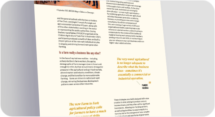 WHAT CONNECTS US We’re seeing vertical concentration strategies that involve integrating upstream and downstream stakeholders to gain more leverage in the supply chains and markets. At the other end of the scale, businesses are striving for diversi昀椀cation – or even multi-specialisation – 4 September 2023, VIVESCIA Village in Châlons-en-Champagne by combining agriculture with non-agricultural activities like power generation, producing biomass, or providing services and strategic and the general outlook with the two co-holders consultancy. As a direct consequence of this, we’re seeing a huge variety of different of the Chair, sociologist François Purseigle and agro-economist Geneviève N’Guyen, along with organisational models, spanning large-scale all the other stakeholders working in the sector reliance on salaried workers; subcontracting to compensate for the erosion of the traditional or representing the public authorities. During model of sharing work among family members; the two round tables VIVESCIA organised at the pooling resources and skills; or outsourcing so Châlons Agricultural Trade Fair in September 2023, participants produced a wealth of ideas and built a you can refocus on your core business and/or on clearer picture of the role each individual can play higher value-added activities. in shaping and driving forward next-generation farming. Is a farm really a business like any other? In the face of myriad new realities – including The very word ‘agricultural’ a sharp decline in farm workers, the ageing is no longer adequate to demographic of farm managers (one in three is old enough to retire, but has no successor), strong price describe what the business pressure in the agricultural and agri-food markets, does –sometimes it’s altered market and industry conditions, climate essentially a commercial or change, and the transition to more sustainable farming – farms are driven to radical and rapid industrial operation. change, mirroring the business development patterns seen across other industries. FRANÇOIS PURSEIGLE The new Farm to Fork These strategies are chie昀氀y designed with value creation in mind, aiming to produce a secure agricultural policy calls income stream, and they often call for signi昀椀cant for farmers to have a much investments. Allowing non-farming partners, as well as legal entities, to acquire equity in a greater range of skills farm has led to the emergence of new, complex and an ability to optimise legal structures and new forms of governance. 10% of farmers are now at the helm of several their practices and their companies, each in a different sector and all under use of increasingly scarce the umbrella of one holding company. resources…” GENEVIÈVE N’GUYEN 21