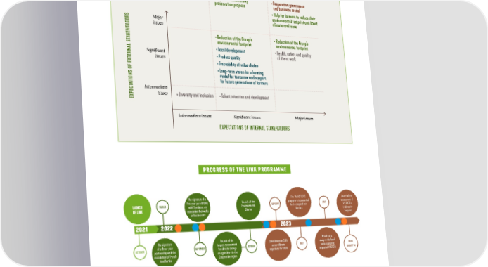 FOSTERING CONNECTIONS MATERIALITY MATRIX THE FOUNDATION OF LINK, OUR CSR STRATEGY LAUNCHED IN 2021 It reveals the convergence of internal and external stakeholders on the importance of and challenges related to our environmental responsibility at Cooperative level and as a Group. • Support for biodiversity • Cooperative governance preservation projects and business model • Help for farmers to reduce their environmental footprint and boost Major climate resilience issues • Reduction of the Group’s • Reduction of the Group’s AKEHOLDERS environmental footprint environmental footprint T • Local development • Health, safety and quality Signi昀椀cant • Product quality of life at work issues • Traceability of value chains • Long-term vision for a farming model for tomorrow and support TIONS OF EXTERNAL S for future generations of farmers A T Intermediate issues • Diversity and Inclusion • Talent retention and development EXPEC Intermediate issues Signi昀椀cant issues Major issues EXPECTATIONS OF INTERNAL STAKEHOLDERS PROGRESS OF THE LINK PROGRAMME The signature of a The TRANSITIONS Launch of the LAUNCH MARCH five-year partnership Launch of the FEBRUARY programme is presented JUNE assessment of with Symbiose, an Environmental to the cooperative’s OF LINK Charter farmers VIVESCIA’s association that works biodiversity on biodiversity footprint 2021 2022 2023 The signature Launch of the Commitment to SBTi Results of a OCTOBER of a three-year SEPTEMBER impact assessment OCTOBER on our climate MAY study on the local partnership with the for climate change socio-economic FROM association of French on agriculture in the objectives for 2030 impact of VIVESCIA JANUARY 24 food banks Cooperative region Board/executive committee CSR workshops Group CSR committee 35