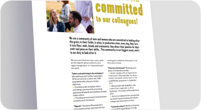FOSTERING CONNECTIONS Our connections to people Now more than ever committed to our colleagues! We are a community of men and women who are committed to looking after the grain; in their fields, in silos, in production sites, every day, they turn it into flour, malt, bread, and croissants; they share their passion for their craft and pass on their skills… This community is our biggest asset, and it is our duty to look after it. We carry out initiatives in four areas, which starting point and de昀椀ne action plans for the are the same for all our entities in every three years to come. region we operate in, in France and around the world. “Diversity and inclusion”: Ramping up our action on three main priorities: “Safety and well-being in the workplace”: ➜ Gender equality, with an improvement We need to go even further. Launched in in the French “Pénicaud index” for all our 2018, we continue to add to the CARE entities* worldwide and the launch of the programme with a focus on its two LeadHERship programme in September objectives: 2023. ➜ Providing a safe workplace where ➜ Hiring people with disabilities, with well-being is paramount by preventing a policy that is applicable to all our psychosocial hazards and creating a stronger businesses. This project will be scaled up in safety culture. 2024. ➜ Providing an environment that facilitates ➜ Access to employment for young people a healthy work-life balance. by reinforcing partnerships with schools, colleges and universities in France. “Talents”: The entire HR community is determined to attract and retain the best “Corporate culture”: Reinforce the group talent. we are working on two fronts: spirit with the “Grain Route,” a 2 ½ day ➜ Strengthening the group’s employer immersive programme from fork to 昀椀eld brand. devoted to managers was relaunched in the spring of 2023. Other initiatives are in the ➜ Boosting our colleagues’ employability through capacity building. pipeline. A 昀椀rst engagement survey was launched in September 2023 on 6,900 employees to set a *Our gender equality index is between 83 and 99. See page 77. 44