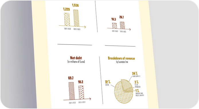 GOING DEEPERGOING DEEPER Revenue EBITDA (millions of Euros) (in millions of Euros) 1,536 1,229 26.7 19.3 2021-2022 2022-2023 2021-2022 2022-2023 Net debt Breakdown of revenue (in millions of Euros) by business line 24 % 69.7 FARM SUPPLIES 10.2 72 % 3 % GRAIN SEEDS PRODUCED 1 % SERVICES AND MISCELLANEOUS 2021-2022 2022-2023 67 67