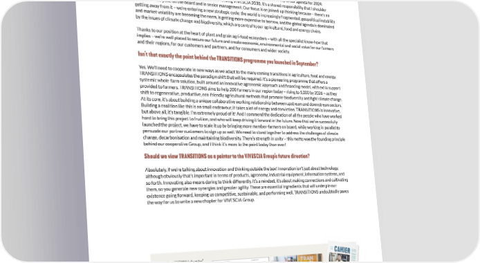 OVERVIEW BY CHRISTOPH BÜREN So with the transformation now well underway, we’re expecting to see even better results and value creation within VIVESCIA Industries’ businesses going forward. Olivier Miaux and his operational directors have their roadmap well in hand, and are devising a strategy for a new chapter in our story. So, this is a new chapter for VIVESCIA Industries and for the Group as a whole? Yes, that’s the thread that runs through everything over the last few months and it’s top of our agenda for 2024: planning our future, charting the way forward, building VIVESCIA 2030. It’s a shared responsibility that I shoulder alongside everyone on the board and in senior management. Our focus is on joined-up thinking because – there’s no getting away from it – we’re entering a new strategic cycle: the world is increasingly fragmented; geopolitical instability and market volatility are becoming the norm, is getting more expensive to borrow, and the global agenda is dominated by the issues of climate change and biodiversity, which are central to our agricultural, food and energy chains. Thanks to our position at the heart of plant and grain agri-food ecosystem – with all the specialist know-how that implies – we’re well placed to secure our future and create economic, environmental and social value for our farmers and their regions, for our customers and partners, and for consumers and wider society. Isn’t that exactly the point behind the TRANSITIONS programme you launched in September? Yes. We’ll need to cooperate in new ways as we adapt to the many coming transitions in agriculture, food and energy. TRANSITIONS encapsulates the paradigm shift that will be required. It’s a pioneering programme that offers a systemic whole-farm solution, built around an innovative agronomic approach and 昀椀nancing model, with extra support provided to farmers. TRANSITIONS aims to help 200 farmers in our region today – rising to 1,000 by 2026 – as they shift to regenerative, productive, eco-friendly agricultural methods that promote biodiversity and 昀椀ght climate change. At its core, it’s about building a unique collaborative working relationship between upstream and downstream sectors. Building a coalition like this is no small endeavour, it takes a lot of energy and conviction. TRANSITIONS is innovative, but above all, it’s tangible. I’m extremely proud of it! And I commend the dedication of all the people who have worked hard to bring this project to fruition, and who will keep driving it forward in the future. Now that we’ve successfully launched the project, we have to scale it up by bringing more member-farmers on board, while working in parallel to persuade our partner customers to sign up as well. We need to stand together to address the challenges of climate change, decarbonisation and maintaining biodiversity. There’s strength in unity – this motto was the founding principle behind our cooperative Group, and I think it’s more to the point today than ever! Should we view TRANSITIONS as a pointer to the VIVESCIA Group’s future direction? Absolutely, if we’re talking about innovation and thinking outside the box! Innovation isn’t just about technology, although obviously that’s important in terms of products, agronomy, industrial equipment, information systems, and so forth. Innovating also means daring to think differently. It’s a mindset, it’s about making connections and cultivating them, so you generate new synergies and greater agility. These are essential ingredients that will underpin our existence going forward, keeping us competitive, sustainable, and performing well. TRANSITIONS undoubtedly paves the way for us to write a new chapter for VIVESCIA Group. To analyse VIVESCIA Industries’ CCAHIER DES AAHIER DES ACCTIONNAIRESTIONNAIRES VIVESCIA INDUSVIVESCIA INDUSTRIES 2022-2023TRIES 2022-2023 OLIVIER MIAUX Gérant de VIVESCIA Industries Results and future prospects, VIVESCIA Industries Une performance économique a démontré sa résilience et confirme sa capacité de en amélioration dans reconquête et de développement profitable et durable à moyen terme sur ses différents marchés, un environnement complexe grâce à la passion, à l’engagement managing director Olivier Miaux et à l’expertise de ses équipes. Les résultats 2022-2023 de VIVESCIA Industries sont supérieurs aux prévisions budgétaires et à l’an dernier dans un environnement inflationniste persistant et de consommation morose. soudaine et de forte ampleur de leurs OLIVIER M. : Je tiens à souligner que ROBERT O’B. : Effectivement, Quel est le bilan de l’exercice écoulé, quelles sont les perspectives pour 2023-2024 ? Échanges avec charges, en particulier des coûts sur le reste de notre portefeuille, l’incertitude demeure concernant Olivier Miaux, gérant de VIVESCIA Industries, et les directeurs généraux des trois grands métiers de VIVESCIA d’électricité. Notre propre facture qui représente 10% de notre chiffre l’évolution de la demande des Industries : Pierre Garcia (Grands Moulins de Paris), Robert O’ Boyle (Délifrance) et Olivier Hautin (Malteurop). d’électricité a triplé ; notre 昀氀otte de d’affaires, les activités maïserie consommateurs, qui reste très camions est également sensible aux (KALIZEA), nutrition animale 昀氀uctuante. Nous avons passé ce prix du carburant. Parallèlement, nous (NEALIA) et biotechnologies cap dif昀椀cile en mettant en place des talks to the three directors of avons poursuivi la mise en place de (ARD) ont réussi à dégager des actions et des réponses adéquates QUE RETENEZ-VOUS DE L’EXERCICE 2022-2023 ? sur les deux derniers exercices par la hausse des coûts. Sur l’exercice, 昀椀lières transversales à l’échelle du performances satisfaisantes. face à la crise de ces 18 derniers mois. rapport à celles supportées en 2020- l’EBITDA a progressé de 136 à 
