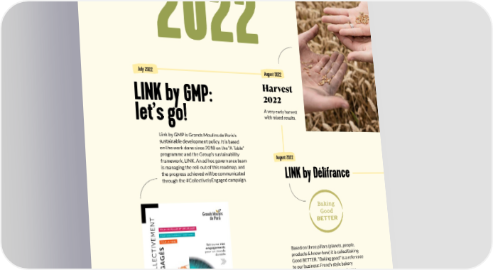 Retrospective 2022 July 2022 August 2022 Harvest LINK by GMP: 2022 A very early harvest let’s go! with mixed results. Link by GMP is Grands Moulins de Paris’s sustainable development policy. It is based on the work done since 2018 on the “A Table” programme and the Group’s sustainability August 2022 framework, LINK. An ad hoc governance team is managing the roll-out of this roadmap, and the progress achieved will be communicated LINK by Délifrance through the #CollectivelyEngaged campaign. Based on three pillars (planets, people, products & know-how) it is called Baking Good BETTER. “Baking good” is a reference to our business: French-style bakery products. “Better” urges us to act now, together, to make sustainability a key part of our action and therefor protect people and the planet. 52