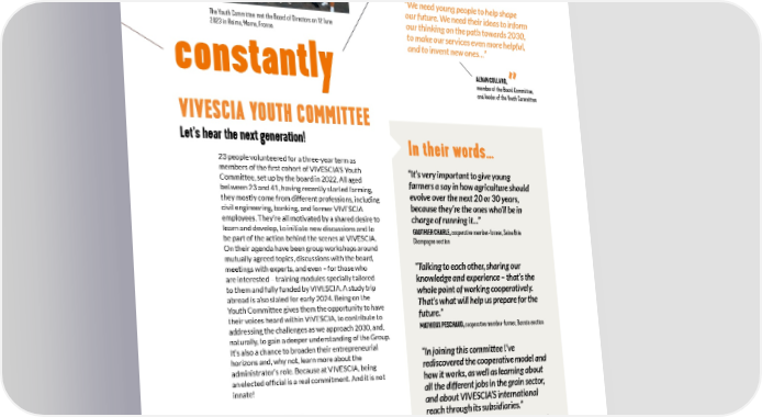 FOSTERING CONNECTIONS evolving “We need young people to help shape our future. We need their ideas to inform The Youth Committee met the Board of Directors on 12 June our thinking on the path towards 2030, 2023 in Reims, Marne, France. to make our services even more helpful, and to invent new ones…” constantly ALBAN COLLARD, member of the Board Committee, and leader of the Youth Committee VIVESCIA YOUTH COMMITTEE Let’s hear the next generation! In their words… 23 people volunteered for a three-year term as members of the 昀椀rst cohort of VIVESCIA’S Youth “It’s very important to give young Committee, set up by the board in 2022. All aged farmers a say in how agriculture should between 23 and 41, having recently started farming, evolve over the next 20 or 30 years, they mostly come from different professions, including because they’re the ones who’ll be in civil engineering, banking, and former VIVESCIA employees. They’re all motivated by a shared desire to charge of running it...” learn and develop, to initiate new discussions and to GAUTHIER CHARLE, cooperative member-farmer, Seine Brie be part of the action behind the scenes at VIVESCIA. Champagne section On their agenda have been group workshops around mutually agreed topics, discussions with the board, meetings with experts, and even – for those who “Talking to each other, sharing our are interested – training modules specially tailored knowledge and experience – that’s the to them and fully funded by VIVESCIA. A study trip whole point of working cooperatively. abroad is also slated for early 2024. Being on the That’s what will help us prepare for the Youth Committee gives them the opportunity to have future.” their voices heard within VIVESCIA, to contribute to addressing the challenges as we approach 2030, and, MATHIEUX PESCHAUD, cooperative member-farmer, Barrois section naturally, to gain a deeper understanding of the Group. It’s also a chance to broaden their entrepreneurial “In joining this committee I’ve horizons and, why not, learn more about the rediscovered the cooperative model and administrator’s role. Because at VIVESCIA, being an elected of昀椀cial is a real commitment. And it is not how it works, as well as learning about innate! all the different jobs in the grain sector, and about VIVESCIA’S international The 23 members of the Youth Committee reach through its subsidiaries.” “I hope that our ideas will be heard and taken onboard. We’ll also be better able to understand the Board’s decisions so we can defend them before our fellow members, if necessary.” JÉRÉMY ORTILLON, cooperative member-farmer, Barrois section 39
