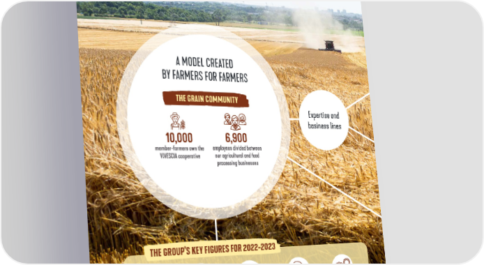 A MODEL CREATED BY FARMERS FOR FARMERS THE GRAIN COMMUNITY Expertise and business lines 10,000 6,900 member-farmers own the employees divided between VIVESCIA cooperative our agricultural and food processing businesses THE GROUP’S KEY FIGURES FOR 2022-2023 52 % 55 €4.6 billion €195 million €122 million of revenue generated production sites revenue EBITDA of investment. on international around the world markets 2