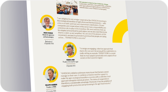 A PROGRAMME THAT IS HAILED FOR ITS RELEVANCE AND INNOVATIVE MODEL 130 people invited to the VIVESCIA village: customers, partners, the authorities, scientific and agricultural organisations, institutional stakeholders and VIVESCIA employees. “I am delighted to see a major cooperative like VIVESCIA investing in the ecological transition of agriculture and the food industry — with a focus on both upstream and downstream stakeholders. Private companies and cooperatives in this sector have a responsibility and a decisive role to play in this transition. We need solutions that can be adapted at local level to each region, but we also need them to be MARC FESNEAU shared, scaled up and amplified. You are one of the pioneers of this Minister for agriculture movement; we need to promote it and show that people are taking and Food sovereignty action… TRANSITIONS is concrete!” Declaration of 9 September 2023 “To design an engaging, collective approach that shares the cost and risk among all the stakeholders is really setting an example. TRANSITIONS is a model that we must adapt to practically every aspect of our FRANCK LEROY society in the Grand Est region.” President of the Grand Est region 8 September 2023 “VIVESCIA’s initiative addresses many issues that farmers cannot manage on their own. It combines a massive need for support to make the agro-ecological transition a success with a collective, local approach alongside individual actors. The status of cooperative is PHILIPPE MAUGUIN therefore a considerable advantage. Moreover, it has the ambition of President of INRAE engaging both production and processing in the agri-food industry.” 8 September 2023 WITH THE SUPPORT OF PARTENAIRE FONDATEUR 32