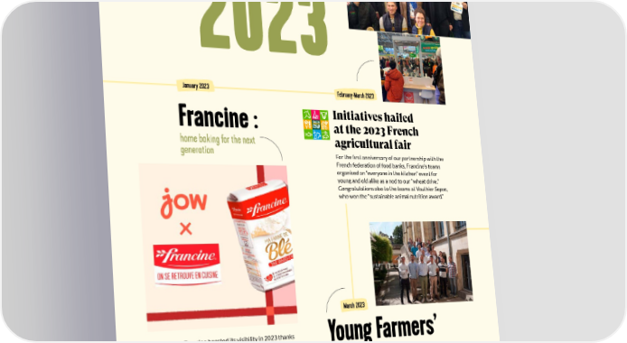 Retrospective 2023 January 2023 February-March 2023 Francine : Initiatives hailed at the 2023 French home baking for the next agricultural fair generation For the 昀椀rst anniversary of our partnership with the French federation of food banks, Francine’s teams organised an “everyone in the kitchen” event for young and old alike as a nod to our “wheat drive.” Congratulations also to the teams at Vauthier Sepac, who won the “sustainable animal nutrition award.” March 2023 Francine boosted its visibility in 2023 thanks Young Farmers’ to three content creators who helped develop delicious new seasonal recipes. French consumers’ favourite 昀氀our brand also Committee: entered into a partnership with the “Jow” app, which aims to simplify home cooking First cohort by helping you only use what you need. This anti-food waste approach is completely 23 young VIVESCIA members, aged 23 to 41, join us for a consistent with Francine’s values and three-year adventure as the 昀椀rst cohort of the Young Farmers commitments. Committee. This committee re昀氀ects the board’s desire to build the Cooperative of the future with and for the next generation. To 昀椀nd out more, read our article on page 39. 54